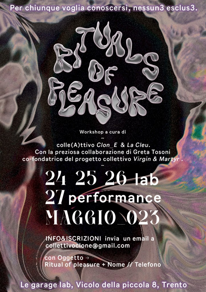 𝓡𝓲𝓽𝓾𝓪𝓵𝓼 𝓸𝓯 𝓹𝓵𝓮𝓪𝓼𝓾𝓻𝓮𝓼 vuole proporre un ciclo di incontri e scambi laboratoriali per indagare il piacere partendo dalla ri-scoperta del corpo con pratiche interdisciplinari gentili: educazione sessuale, performance e costruzione di tecnologie Do It Yourself (DIY). E si concluderà con un rituale performativo collettivo.