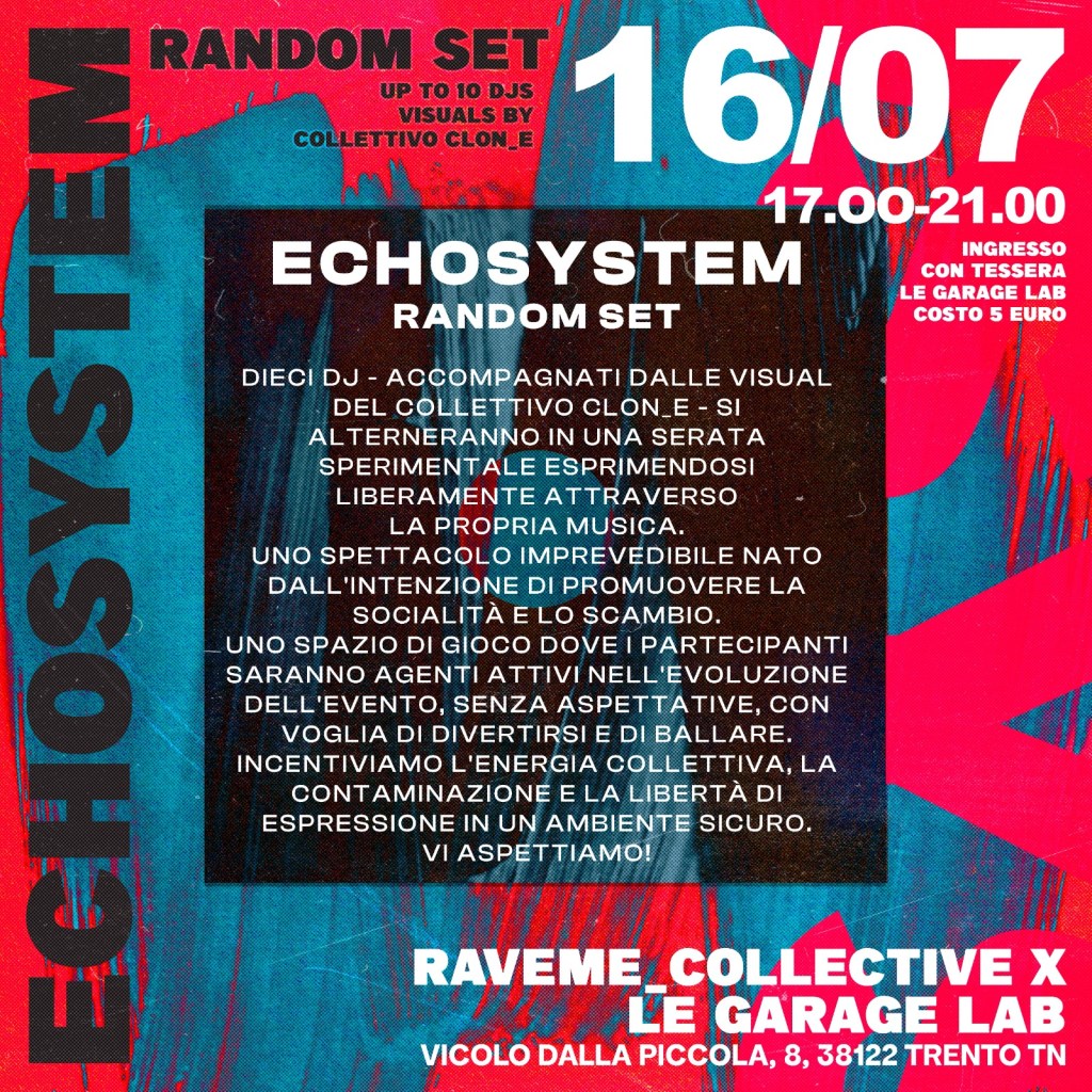 Echosystem è un ciclo di eventi di musica elettronica a Trento ideato dal collettivo RaveMe in collaborazione con Le Garage Lab e le visual artist Clon_E.